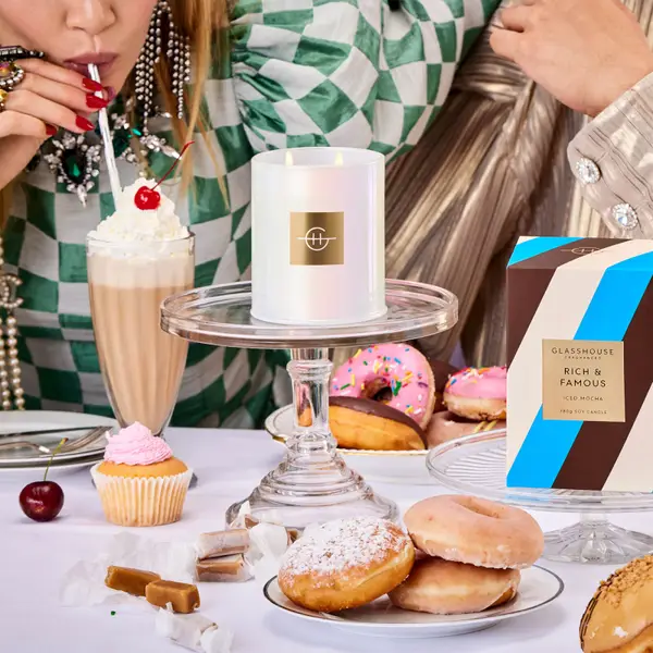 A mouth-watering scent that evokes memories of a party table laid with delectable treats, the Glasshouse Fragrances Rich and Famous Candle imbues the atmosphere in a sweet and intoxicating aroma.