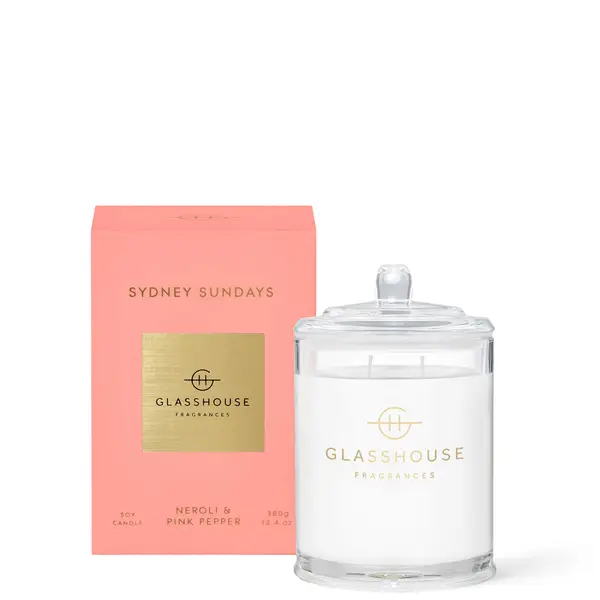 The Glasshouse Fragrances Sydney Sundays Candle transports the senses to sun-drenched sands and sparkling seas. Notes of juicy grapefruit and mandarin transcend into a breeze of neroli, jasmine and pink peppercorn, creating a warm, inviting ambience.