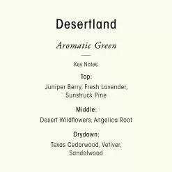 The Desertland candle has bright, crisp notes of juniper berry, wildflowers, and cedarwood.
