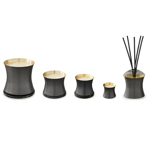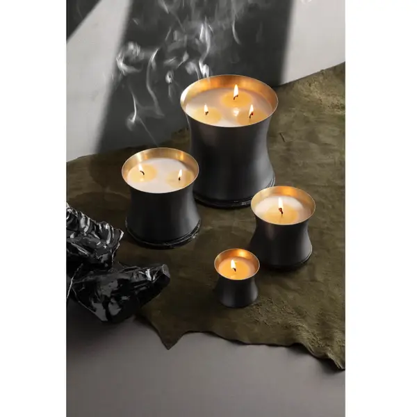 Influenced by the endless search to transform basic materials into a valuable substance, sharp black pepper, woody cypress, eucalyptus, exotic patchouli and smoky guaiac wood combine to create the precious perfume of Alchemy. Encased in a hand-spun matte black patina brass vessel, with a solid Udaipur black marble lid.